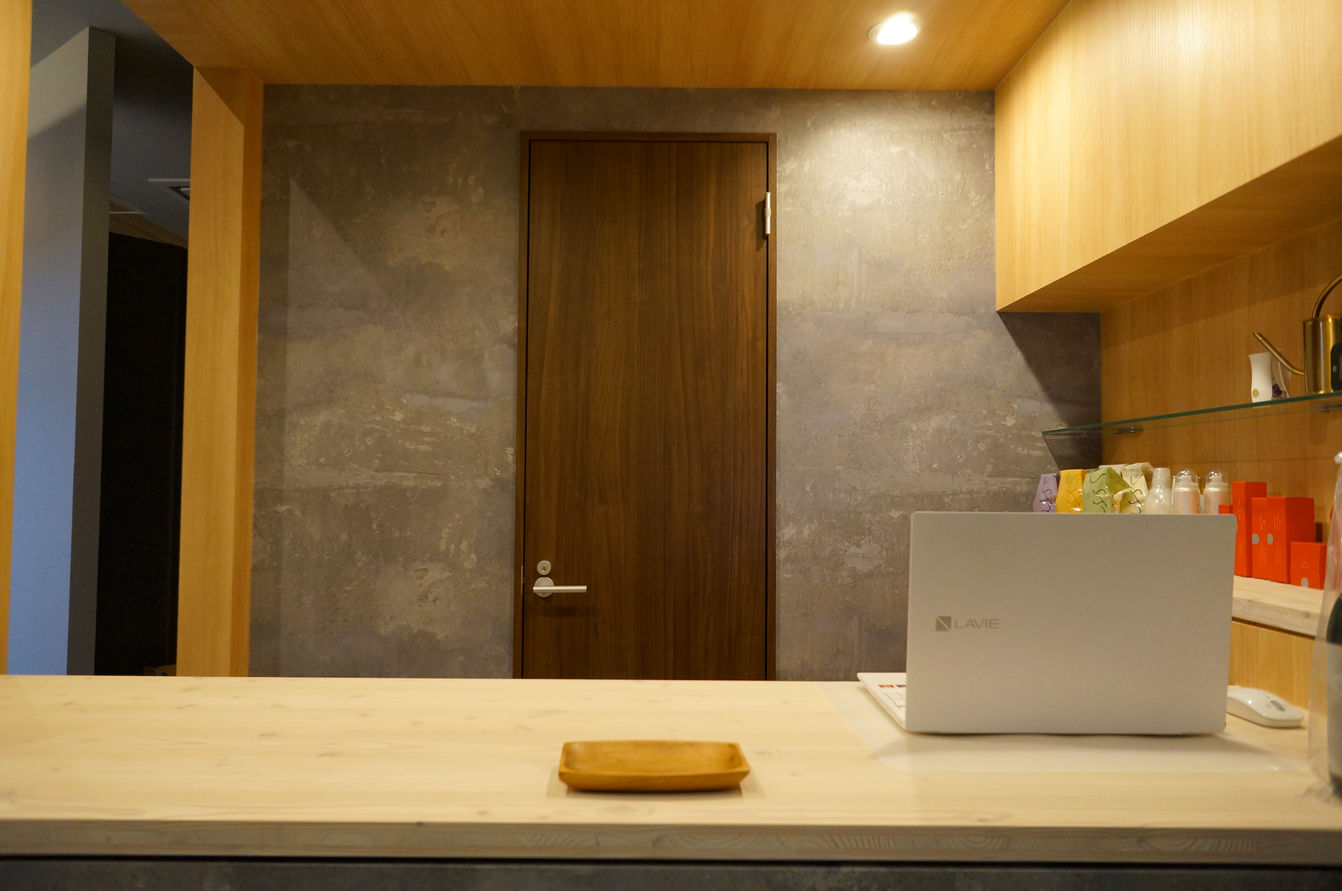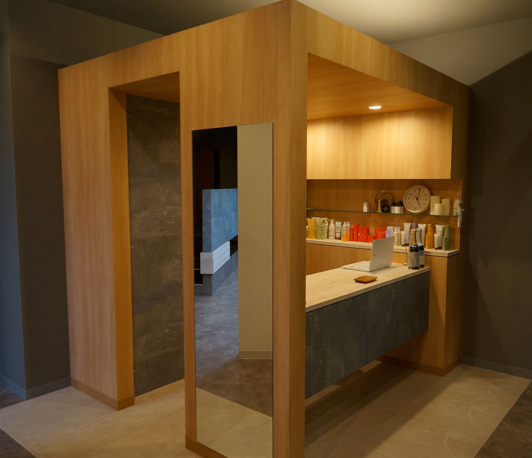 『オーナーがステージに立っているような白壁の門』をデザインコンセプトに、受付・カットスペース・シャンプースペースを小さな建物に見立て、3つの異なるインテリアデザインが天井の高い空間の中で躍動的に表現されています。